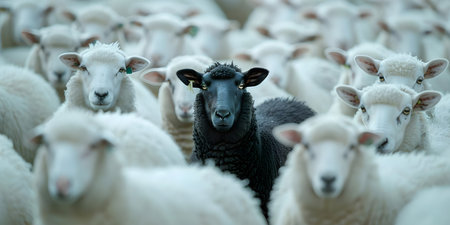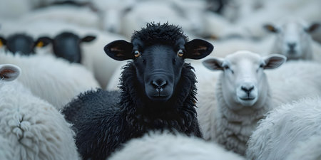 Closeup of one black sheep among a flock of white sheep symbolizing uniqueness and standing out from the crowd. Concept Black Sheep Symbolism, Uniqueness, Standing Out, Flock of Sheep