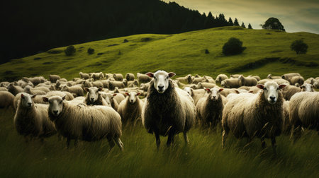 A flock of sheep grazing in a field in the countryside, AI Generated illustration