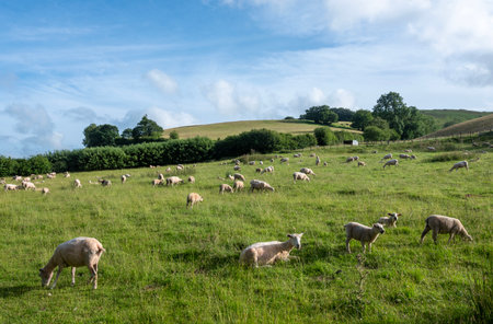 sheep in lush green nature of english national park exmoor under cloudy sky in summer
