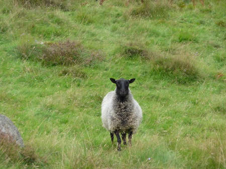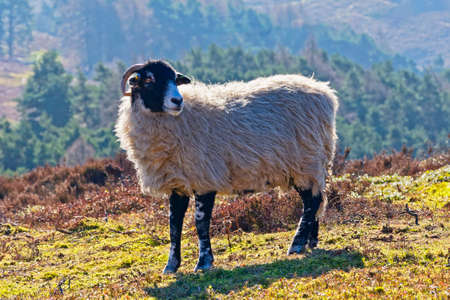Close up of a Swaledale sheep standing on a hillside on Derwent Moor in the Derbyshire Peak District.