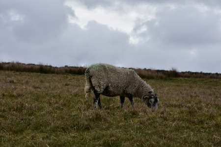 A grazing swaledale sheep on a gray overcast day in England.