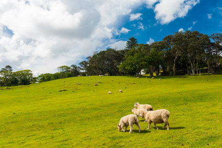 White wool sheep grazing in a green grass field