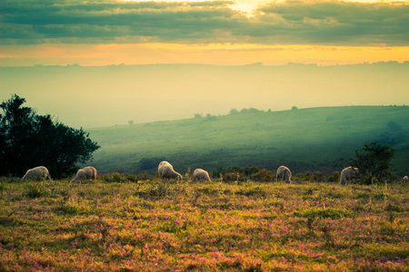 Winter evening light on sheep grazing in a field in the South Downs
