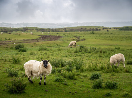 Idillic landscape with sheep, lambs, ram on a perfect juicy green grass fields and hills near ocean, Cornwall, England, United Kingdom