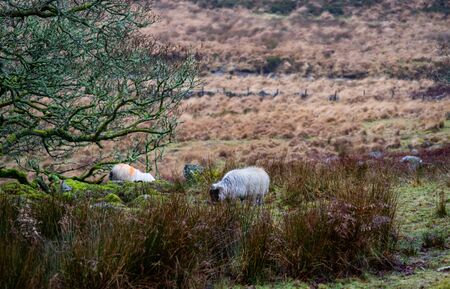Sheep family grazing in the park Dartmoor in southern England.