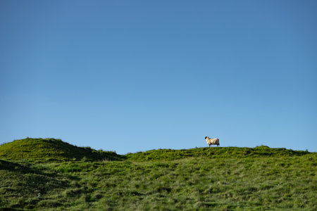 A lone sheep grazing on a beautiful meadow for grazing