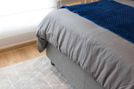 Dark blue color bedroom interior design. Unmade bed in the room. Minimalism, interior, comfort and bedding concept. Bed at home bedroom. Empty bed in morning time.