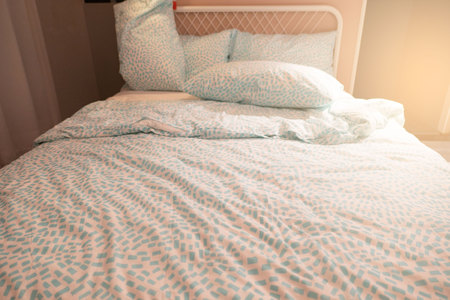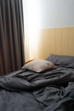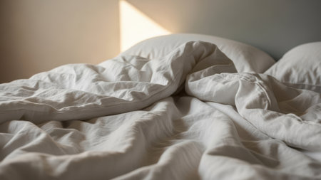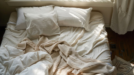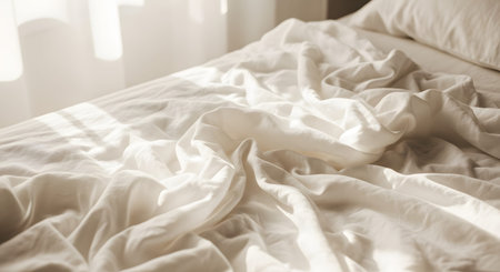 Soft bedding with rumpled sheets and pillows on a cozy bed in a serene morning light