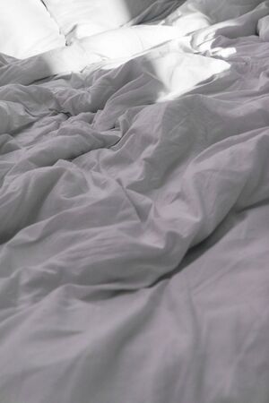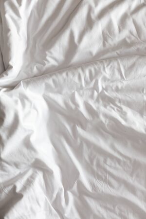 Top view of the crease of an unmade bed sheet in the bedroom after a long night sleep and waking up in the morning.