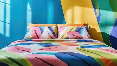 A visually striking bedroom featuring colorful bedding and an abstract wall design, creating a modern and inviting space full of comfort and creativity.