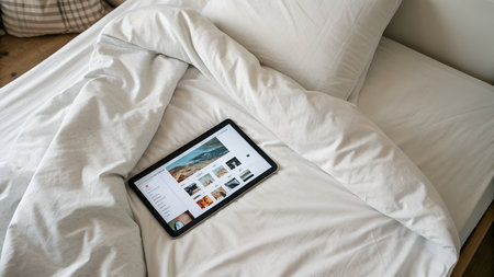 sunlight casting soft shadows on a pure white bedspread, created with generative ai