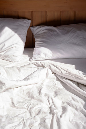 Unmade bed with white linen in sunlight. Cozy morning scene. Clean bedroom interior for relaxation concept.
