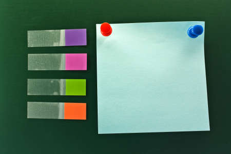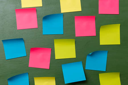 Many blank colorful memory stickers on a dark green background. The empty space on multi-colored office stickers. Busy day, business concept.