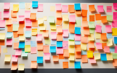 Panoramic banner copy space. many blank colored sheets sticky note paper on white board background in office, business meeting, creative idea, digital online marketing and business financial concept