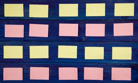 yellow and pink pieces of paper for notes on a blue wooden background - horizontal image top view