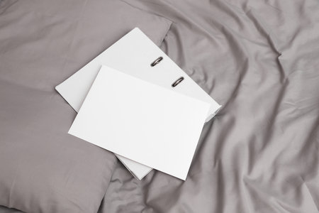 White rings folder with blank paper sheet lies on the bed sheet with pillows