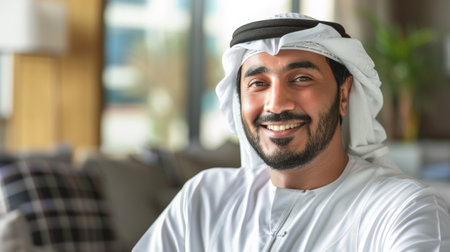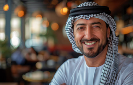 A captivating photograph ideal for cultural features, diversity campaigns, or as a respectful representation of Middle Eastern heritage | This image exudes warmth and friendliness, focusing on a man dressed in traditional Middle Eastern clothing, his smile exuding hospitality and openness. The impeccable white of his allure contrasts effectively against the blurred background of a modern, well-lit space, symbolizing the harmonious blend of tradition and modernity. The subject's smile and engaging eyes are sharp in detail, conveying a sense of genuine welcome that transcends cultural boundaries. His allure, characterized by a kandura and a neatly wrapped ghutra held in place by an equal, represents cultural identity and regional pride. The light cascading over the scene highlights its features, enhancing the texture of the fabric and the authenticity of the moment | Suitable for inclusion in travel brochures emphasizing cultural experiences, educational material about global attraction, or as a positive and inclusive image in corporate diversity and inclusion materials. The photograph could also be used by tourism boards or in a personal setting, serving as inviting wall art that reflects cultural richness and intercultural dialogue | a high-resolution photo of a smiling man in Middle Eastern dress, sharply focused against a soft-focus background, offering a narrative of cultural celebration under warm indoor lighting, ideal for overlaying text for articles or headlines