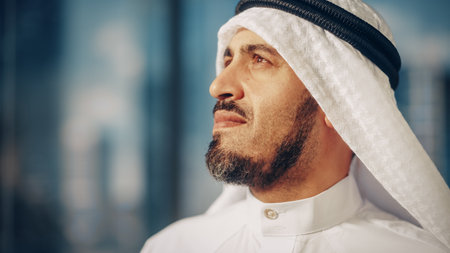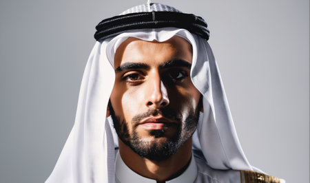 Close up portrait of a businessman wearing traditional keffiyeh, conveying confidence and cultural pride