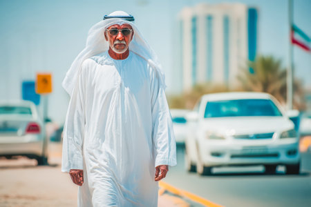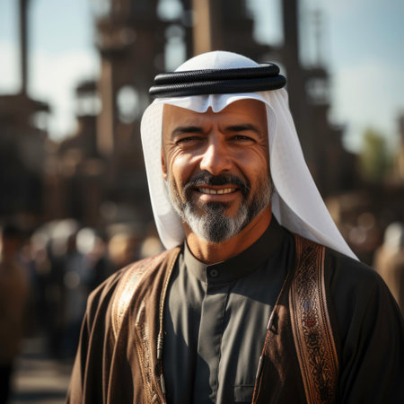 A captivating portrait well-suited for cultural studies, global diversity campaigns, or travel and lifestyle features | The photograph showcases a cheerful gentleman dressed in traditional Arab attire, his attire immaculate and indicative of the region's cultural identity. His engaging smile, the main focal point of the image, radiates warmth and friendliness, inviting cultural appreciation and human connection. The soft bokeh background with urban elements and indistinct passersby puts emphasis on the man, yet subtly hints at a vibrant city life that surrounds him. The traditional headwear, known as a keffiyeh or ghutrah, is wrapped neatly around his head, and accompanied by an 'agal, shows the elegance and pride intertwined with cultural allure. Natural light casts a soft glow on his face, highlighting facial features and reflecting a sense of joy and contentment, while understated shadows add depth to the portrait. His traditional white robe, known as a dishdasha or thobe, adds a sense of purity and simplicity to the composition | This image is versatile, suitable for educational material related to cultural allure, as part of an editorial in travel magazines that explores local customs, or as a representation of inclusivity in international business contexts. It could also be featured in marketing materials for events centered around cultural diversity or as harmonious wall art that celebrates human diversity and cultural pride | a close-up photo of a man smiling in traditional Arab attire, with a softly blurred cityscape in the background, encapsulating a moment of human joy within a cultural context, with room for overlays of text or design elements