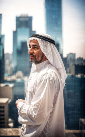 rich arab businessman in Traditional White Outfit in big city in background, generative AI