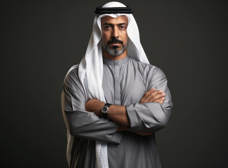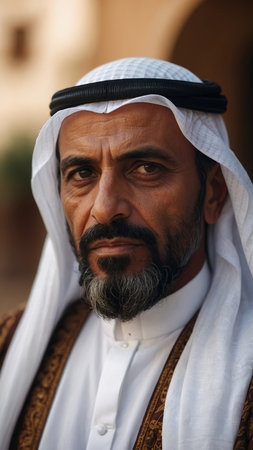 A dignified Arab man poses for a portrait, exuding confidence and cultural heritage through his attire and expression AI generated.