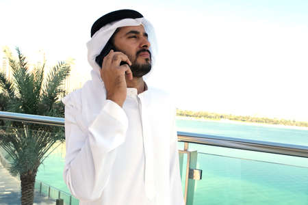 Arab Middle Eastern male model talking to phone wearing traditional dish dash gulf menswear