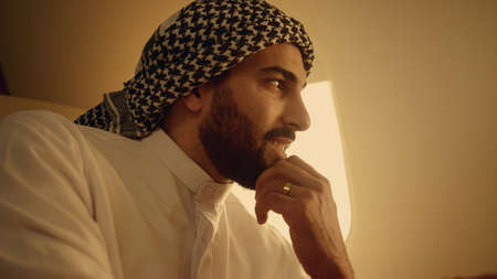 Bearded arabian guy in traditional headwear reading prayers
