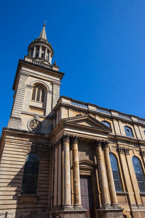 Looking up the exterior of All Saints Church in Oxford. It now houses the library for Lincoln College - one of the historic colleges of Oxford University.