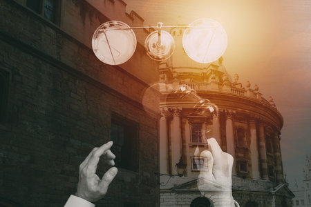 justice and law concept.Top view of Male judge hand in a courtroom with the gavel and brass scale on dark wood table,with buildings exposure