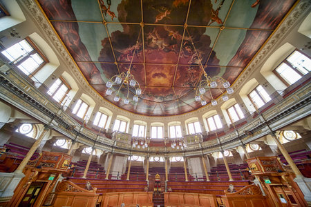 OXFORD, ENGLAND – MAY 15, 2009: Sheldonian Theatre interior with semi-circular auditorium for the university ceremonies and glorious allegorical ceiling fresco by Robert Streater. Oxford. England
