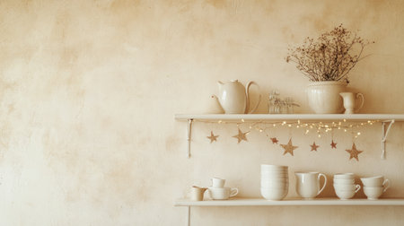 Rustic kitchen shelves with ceramics and natural decor. That the image is generated using AI.