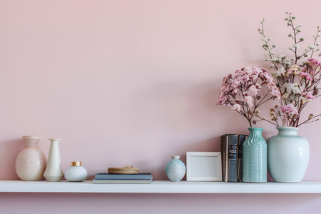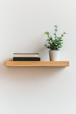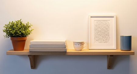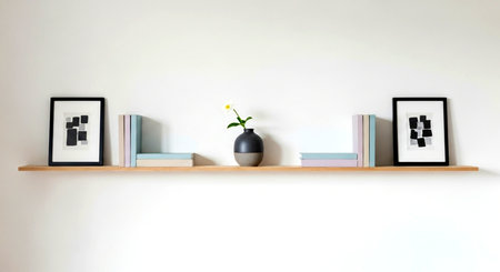 a minimalist floating shelf with art, books, and a vase, creating a modern and stylish home interior decor