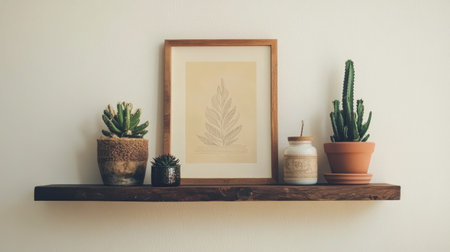 Mock up wooden frame and plant on shelf with white wall background, minimal style backdrop, modern gallery with copy space backdrop. Generative AI