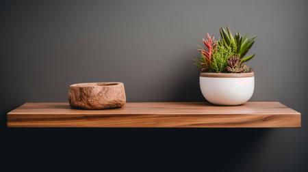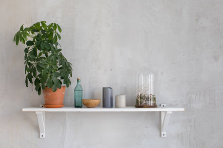 Small shelf with flowerpot and simple decor on gray wall.