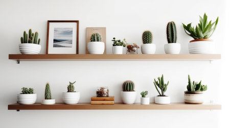 A beautifully organized shelf featuring an array of indoor plants, ceramic pots, and books, creating a serene and modern aesthetic for interior decoration.
