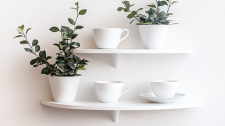 This image features a stylish display of white cups and potted plants on minimalist shelves, creating a serene and modern interior atmosphere perfect for any decor.