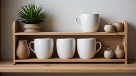 White ceramic mugs arranged on a wooden shelf with decorative plants and vases in a minimalist kitchen setup