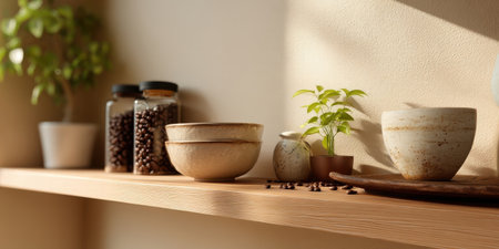 Coffee bean jar bowl plant ceramic cup on wooden shelf with warm sunlight in cozy kitchen