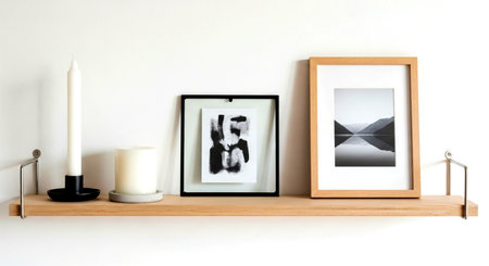 a minimalist shelf displays candles and framed art against a clean white wall, creating a serene interior This image features a transparent background, making it versatile for various design projects.