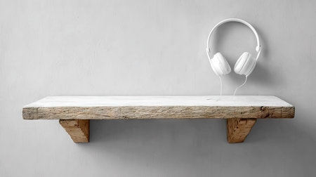 Pair of white headphones is hanging from a light brownish-gray wooden shelf against a light gray wall. The shelf has natural wood grain and rustic wooden brackets.