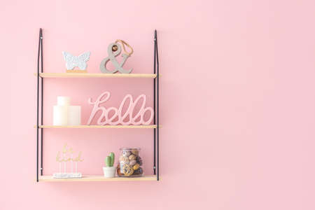 Shelves with decor hanging on color wall