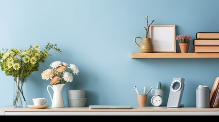 Image of Creative Workspace Desk with office accessories, blank photo frame or poster, book, plant on blue background. Mockup Space, Home Office Desktop Workspace. telephoto lens studio lighting
