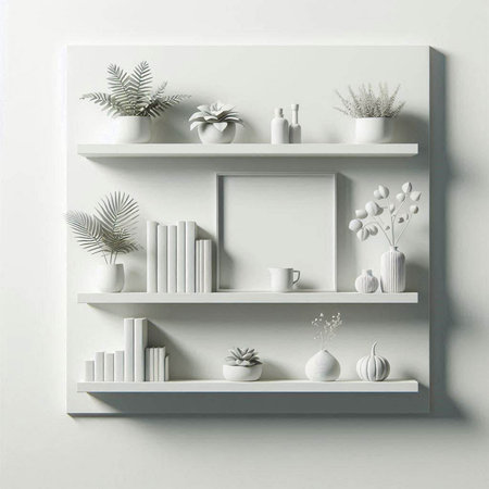 White bookshelf with vases and plants on white wall background