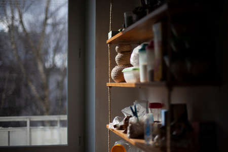 Items on the shelf in the kitchen. Things in the room. The light from the window falls on the shelf with food.