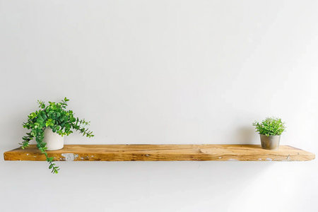 Wooden shelf on white wall with green plant. generative AI.