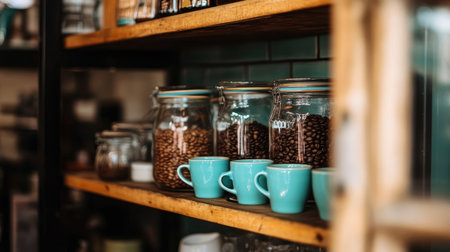Inviting coffee shop scene featuring jars filled with coffee beans, teal cups, and rustic wooden shelves. Ideal for showcasing cozy beverage culture.
