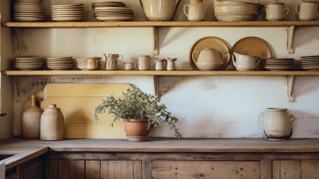 Rustic wooden kitchen shelves displaying pottery, jars, and utensils, creating a cozy and vintage atmosphere.