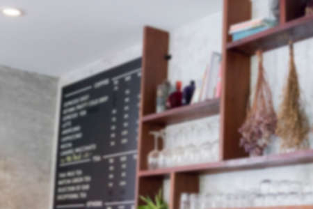 blur image of cup and glass on wooden shelf and menu on blackboard