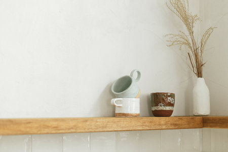 Wooden shelf with utensils, cups and decor on rustic wall background in modern kitchen in new scandinavian house. Modern kitchen interior and stylish accessories