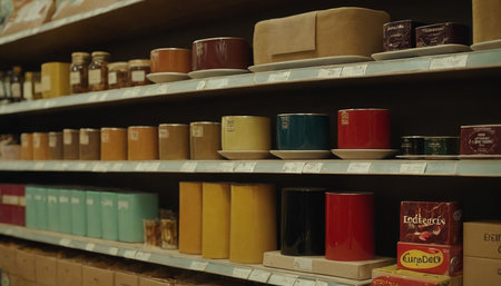 A shelf with cups and mugs on it, AI